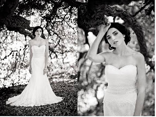 Left - Lavanda Garza Paris embroidered tulle lace gown with bow bust detailing in blanco $4,100 by La Sposa, floor length one tier veil with white over lock trim $198 and Swarovski crystal star earrings $132 all at Samantha Wynne