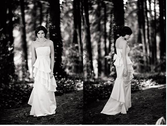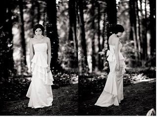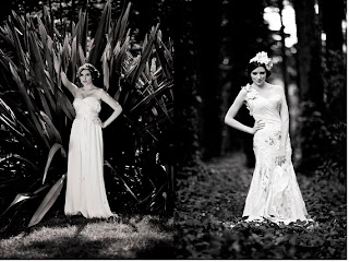 Right - Picot silk satin organza gown with picot-edged ruffled petals $1,785 by Aurelio Costarella at Becker Minty, double corsage aliceband $23 from Diva and white pearl earrings $77 from Sybella Jewellery