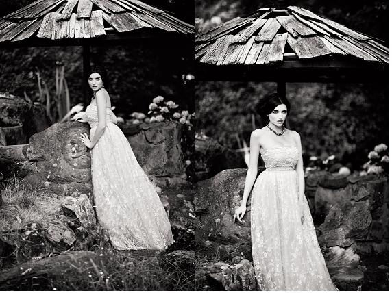 Beaded French lace gown in cream $POA from Collette Dinnigan and grey pearl necklace $195 from Sybella Jewellery