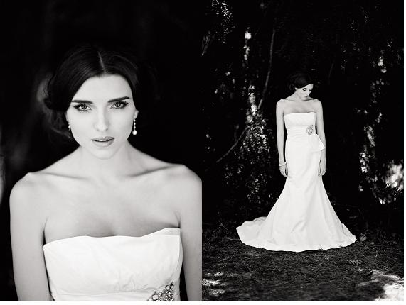 Aubrey silk taffeta gown with Swarovski crystal waist detailing $7,695 by Amsale at Angela Wilson with long drop crystal and pearl earrings $98 and white pearl bracelet $97 Sybella Jewellery