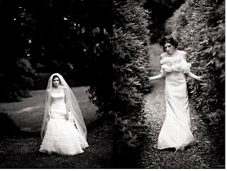 Left - Sabrina heavy silk satin gown with corset, full skirt and wrapping bust $4,240 with Lola Swarovski crystal headpiece $440 both from Johanna Johnson